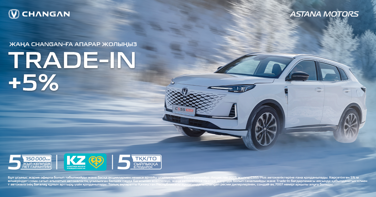 Бұл ұсыныс жария оферта болып табылмайды, тек Changan CS55 Plus 2025 жылғы автомобильдерге арналған және басқа акциялар немесе арнайы ұсыныстармен біріктірілмейді.